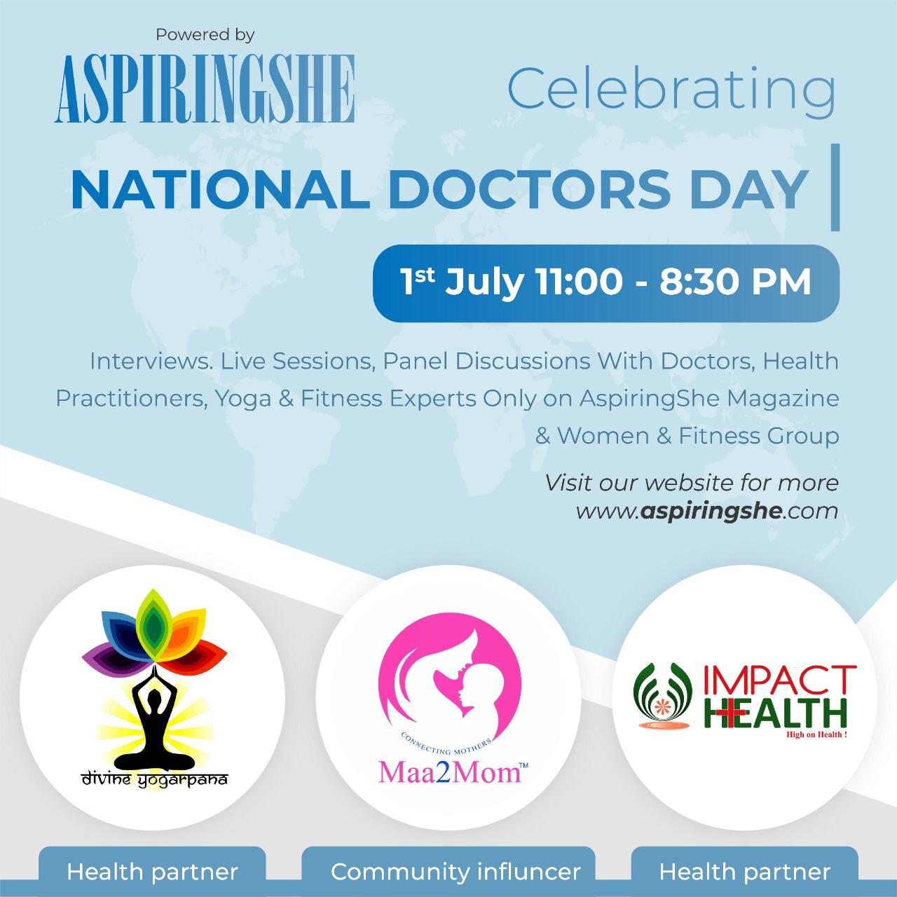 Recognizing the nobility of this profession, AspiringShe is celebrating the International Doctors day by organizing a full day long back to back live sessions, Panel Discussions and consultations from the Doctor Fraternity. These LIVE Sessions will be available from 11 AM on 1st July, Wednesday till 8.30 PM in the evening and will be hosted and moderated by AspiringShe and its health Partners DIVINE YOGARPANA & IMPACT HEALTH. Our community influencer for this is Maa2Mom.